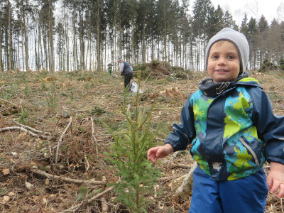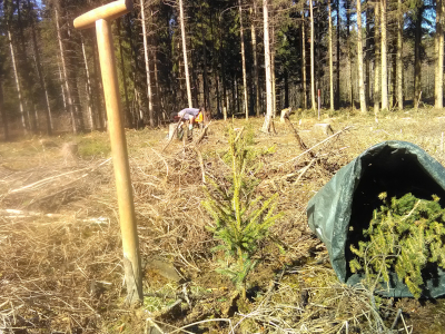 Pflanzung Laubholz, Fichte und Douglasie inkl. Schutz mit Pfisterpfahl. Pflanzung 12 tsd Stück mit Hohlspaten.